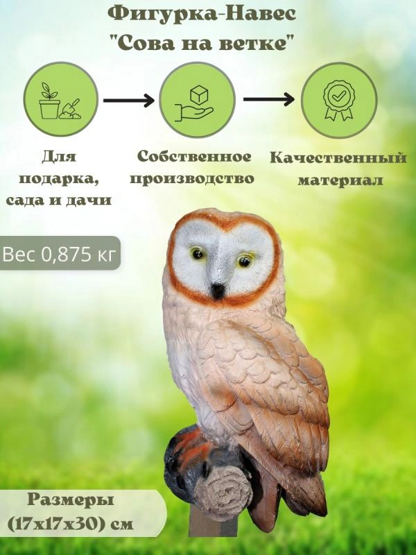 Статуэтка навесная "Сова на ветке" станет оригинальным решением, которое не только предаст красоту интерьера дома и сада, а также привлечет взгляд Ваших гостей. Декоративная статуэтка выполнена из искусственного каменя - полистоун. Благодаря отсутствию микротрещин и пор, в теле камня не "заселяется" грибок и разные болезнетворные бактерии, кроме того хорошо переносит перепады температур. Основная уникальность статуэтки для интерьера в том, что её красят исключительно вручную. Декоративная статуэтка является отличной идеей для подарка друзьям и близким, которые будут приятно удивлены и рады такому необычному сюрпризу.
