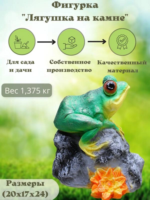 Статуэтка "Лягушка на камне" станет оригинальным решением, которое не только предаст красоту интерьера дома и сада, а также привлечет взгляд Ваших гостей. Декоративная статуэтка выполнена из искусственного каменя - полистоун. Благодаря отсутствию микротрещин и пор, в теле камня не "заселяется" грибок и разные болезнетворные бактерии, кроме того хорошо переносит перепады температур. Основная уникальность статуэтки для интерьера в том, что её красят исключительно вручную. Декоративная статуэтка является отличной идеей для подарка друзьям и близким, которые будут приятно удивлены и рады такому необычному сюрпризу.