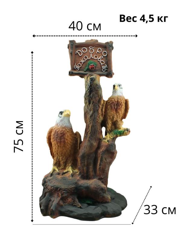 Фигурка садовая "Дерево с фонарем: два Орла" станет оригинальным элементом декора Вашего ландшафтного дизайна. Два орла и дополняющий их фонарик, прекрасно разместятся на альпийской горке, зеленом газоне и даже искусственном водоеме. Дизайн орлов с фонарём не оставит равнодушных и привлечет взгляд Ваших гостей. Фигурка орлов с фонарем декоративных изготовлена из искусственного камня - полистоун. Благодаря отсутствию микротрещин и пор, в теле камня не "заселяется" грибок и разные болезнетворные бактерии, кроме того хорошо переносит перепады температур. Фигурка садовая орлов с фонарем служит отличной идеей для подарка друзьям и близким, которые будут приятно удивлены и рады такому необычному сюрпризу.