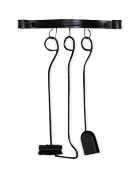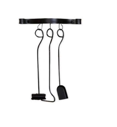 Настенный аксессуар для камина включает в себя кочергу, лопатку и щетку. Изготовлен из металла, прочный и устойчивый.