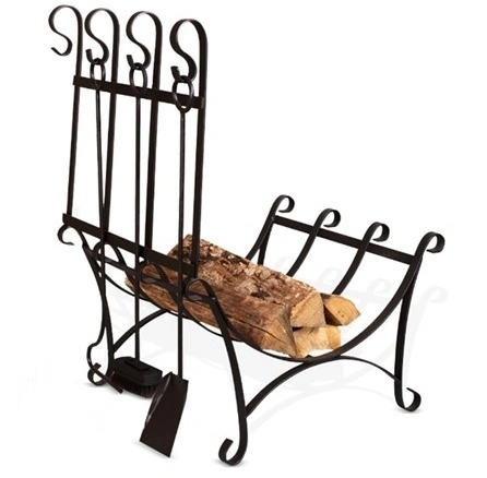 Дровница для хранения поленьев. Материал изготовления: металл. Декоративные элементы: завитки. Комплектуающие: совок, кочерга, щетка.