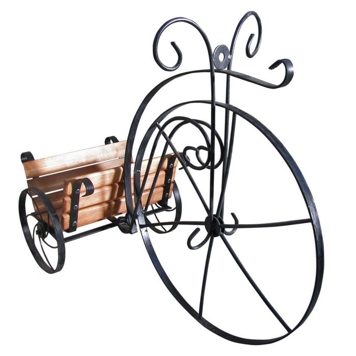 Основу конструкции садовой подставки 59-402 составляет, кованый металлический каркас и деревянные кадки для подставки растений. Данная модель имеет форму изящного, старомодного велосипеда.