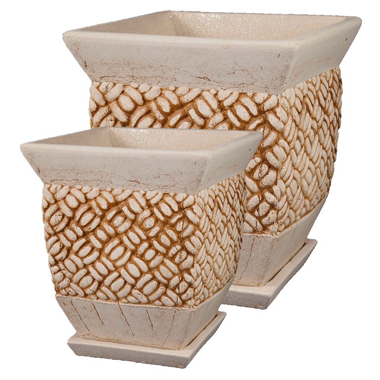 Горшок керамический Орфия выполнен в эффектной форме квадратного колокольчика с расширяющимися краями кверху и зауженного книзу. Имеет оригинальный декор в центральной части в виде корзиночного объёмного плетения, выделенного коричневым цветом. Изготавливается в среднем и большом объёме, имеет дренажное отверстие и квадратный поддон. Изнутри горшок покрыт кварцевой глазурью, которая защищает горшок, сохраняет необходимый уровень влажности и продлевает его срок службы. Изготовленный из шамотной глины, горшок подходит для установки вне помещений. Он станет прекрасной клумбой на загородном участке с вашими любимыми цветами. Сад обретёт яркие краски и оригинальность.