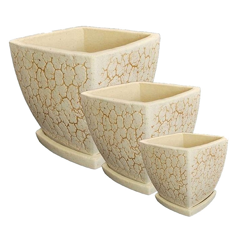 Цветочный горшок изготовлен из шамотной глины высокотемпературного обжига. Изнутри покрыт специальной кварцевой глазурью. Выполнен в бежевом цвете с тёмно коричневыми трещинками. Декорирован узорами из линий, имитирующими растрескавшуюся поверхность. Горшок по форме напоминает высокую чашу с квадратным сечением, с расширяющимися вверх стенками.