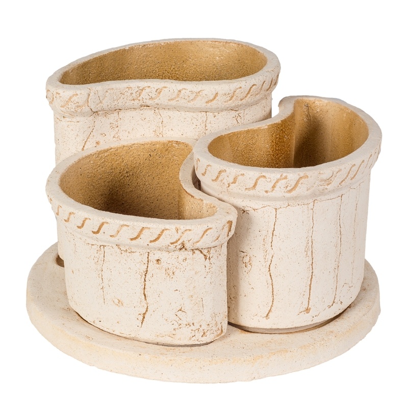 Керамический комплекс из трех кашпо изготовлен из шамотной глины высокотемпературного обжига. Покрыт специальной кварцевой глазурью. Выполнен в бежевом цвете. Декорирована узорами из линий, имитирующими лёгкие трещинки под старину. Керамический комплекс из трех кашпо неправильной разной высоты, объединенных общей подставкой.