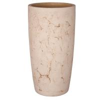 Цветочный горшок изготовлен из шамотной глины высокотемпературного обжига. Изнутри покрыт специальной кварцевой глазурью. Выполнен в бежевом цвете. Декорирован узорами из линий, имитирующими лёгкие трещинки под старину. Горшок по форме напоминает большой высокий горшок вытянутый снизу вверх.