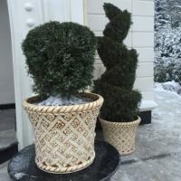 Горшок керамический Валентин выполнен в виде классического горшка с интересным декором. По верхнему и нижнему краю горшка расположен ободок в виде объёмного жгута. Между ними расположено ромбовидное плетение в ромбах которого проглядывают объёмные маленькие цветочки. Горшок с таким оригинальным декором является прекрасным украшением любого интерьера. Выполненный в большом размере, он гармонично смотрится с высокими декоративными деревцами, пальмами.