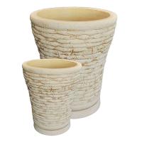 Цветочный горшок изготовлен из шамотной глины высокотемпературного обжига. Изнутри покрыт специальной кварцевой глазурью. Выполнен в бежевом цвете. Декорирован объёмными волнообразными горизонтальными полосами, имитирующими плетение. Горшок по форме напоминает вытянутый цилиндр с расширяющими краями от центральной части кверху.