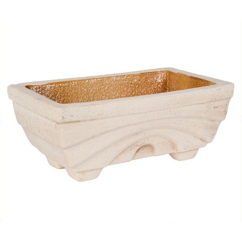 Цветочный горшок - кашпо изготовлен из шамотной глины высокотемпературного обжига. Изнутри покрыт специальной кварцевой глазурью. Выполнен в бежевом цвете. Декорирован объёмными ступенчатыми волнами. Кашпо по форме напоминает прямоугольник сужающийся книзу на ножках.
