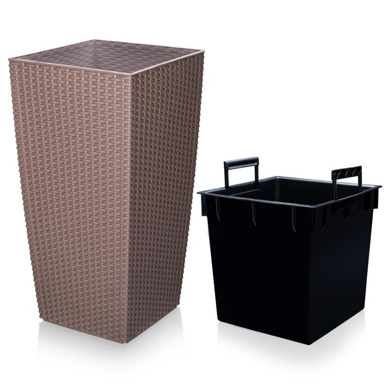 Кашпо компании «Эльфпласт» выполнено из высококачественного ударопрочного пластика. Кашпо имеет гладкую матовую поверхность, что делает его стильным элементом декора. Специальная внутренняя вставка, которая имеет удобные ручки, облегчит процесс высадки растения и уход за ним. Влага в пластиковых горшках задерживается дольше и растения не нуждаются в частом поливе. Размеры изделия - высота 565 мм, длина и ширина – 295 мм, высота вставки - 285 мм, длина и ширина – 263 мм, объём вставки – 17 л.
