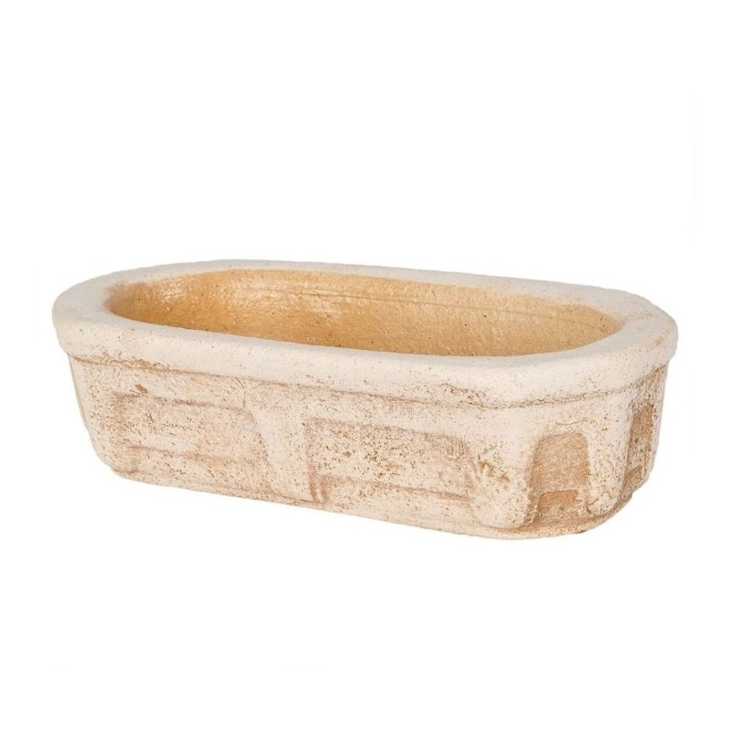 Цветочный горшок-кашпо изготовлен из шамотной глины высокотемпературного обжига. Изнутри покрыт специальной кварцевой глазурью. Выполнен в бежевом цвете. Декорирован узорами из линий, имитирующими лёгкие трещинки под старину. Кашпо имеет вытянутую овальную форму с ободком по верхнему краю.