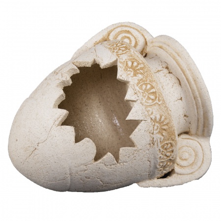 Фигура для сада изготовлена из шамотной глины высокотемпературного обжига. Покрыта специальной кварцевой глазурью. Выполнена в бежевом цвете с коричневым в области декора. Декорирована узорами из линий, имитирующими лёгкие трещинки под старину, ручками-завитками и и лентообразным растительным узором. Фигура для сада по форме напоминает древнегреческий сосуд - амфору с округлым низом, лежащую на боку с отколовшимся небольшим куском.