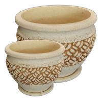 Горшок Гера имеет бочонкообразную форму с небольшим ободком по верхнему краю. Он имеет интересный декоративный узор, расположенный по кругу в центральной части горшка в виде оригинального плетения. Горшок представлен серией в двух размерах, имеет дренажное отверстие и поддон. Он прекрасно подойдёт для создания зелёных зон в кафе, гостиницах. Красиво будет смотреться, и украшать веранды, балконы и лестницы загородного дома с любимыми цветами. Обладая морозоустойчивостью и прочностью данные горшки можно устанавливать на улице.