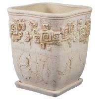 Цветочный горшок изготовлен из шамотной глины высокотемпературного обжига. Изнутри покрыт специальной кварцевой глазурью. Выполнен в бежевом цвете с добавлением коричневого в области декора. Декорирован в верхней части по всему объёму изящным орнаментом из ассиметрично расположенных меандров. Горшок по форме напоминает квадрат с овальными углами и плавно изогнутыми стенками сужающимися книзу.