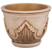 Цветочный горшок изготовлен из шамотной глины высокотемпературного обжига. Изнутри покрыт специальной кварцевой глазурью. Выполнен в бежевом цвете с коричневым цветом в области узора. Декорирован узорами в виде листьев с лучами внутри по низу горшка. Горшок по форме напоминает классический горшок с ободком вверху.