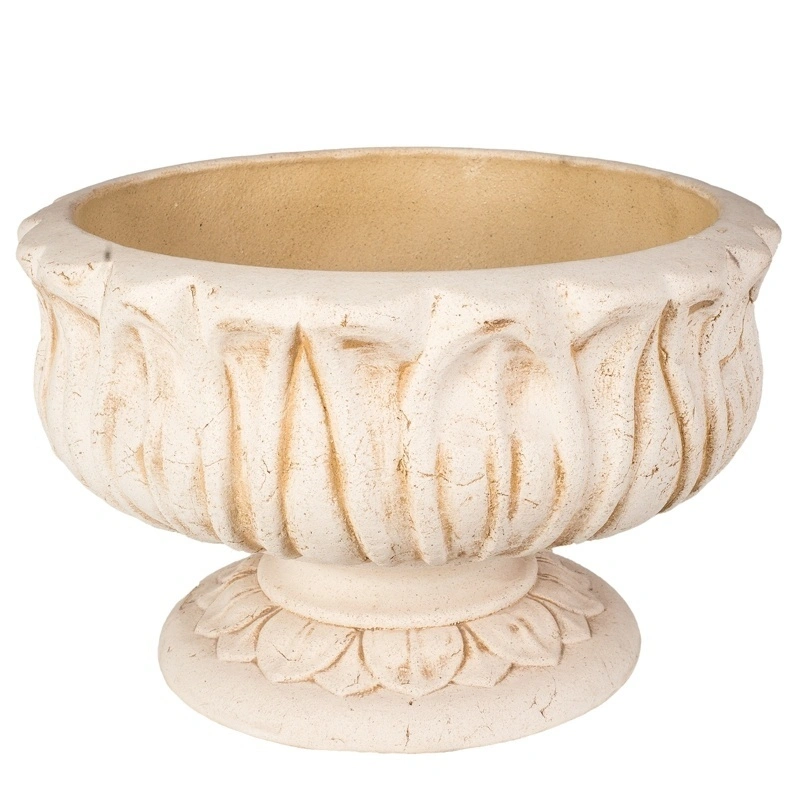 Вазон для сада изготовлен из шамотной глины высокотемпературного обжига. Изнутри покрыт специальной кварцевой глазурью. Выполнен в бежевом цвете с коричневым в области декора. Декорирован узорами из линий, имитирующими лёгкие трещинки под старину и рельефными элементами в виде больших лепестков расположенных по чаше вазона, а также объёмными узорами из листьев по ножке. Керамический вазон по форме напоминает большую сжатую чашу на ножке.