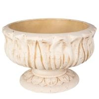 Керамический вазон для сада Вазон Крокус большой имеет форму большой круглой, слегка сжатой чаши. Особенностью вазона является нежный декор, выполненный в виде объёмных элементов напоминающих лепестки большого цветка, обрамляющие чашу. Устойчивая круглая ножка вазона украшена узором из листьев. Керамический вазон выполнен в бежевом цвете с добавлением коричневого цвета в области декора. Эффектный вазон Крокус большой может сочетаться с вазоном Крокус малый, который имеет меньшие размеры, так как они имеют одинаковый дизайн.