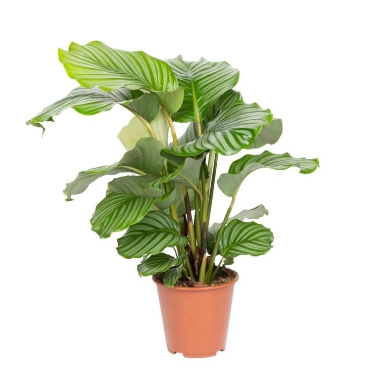 Калатея Орбифолия — поразительное тропическое растение с большими круглыми листьями с замысловатыми узорами и яркими зелеными оттенками. Листья представляют собой сочетание светло- и темно-зеленого цвета с контрастными серебристыми полосами, благодаря чему они выделяются в любом помещении. Листья растения также отличаются тем, что они слегка сморщены и имеют бархатистую текстуру. Калатея Орбифолия хорошо растет при ярком непрямом свете и предпочитает влажную почву с хорошим дренажем. Благодаря привлекательной листве и простоте ухода это растение является отличным выбором для любителей растений с любым уровнем опыта.