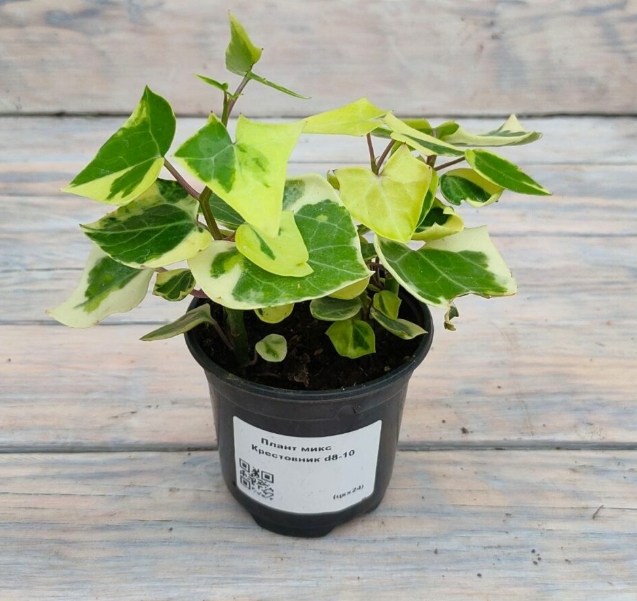 Листья кожистые, длиной до 8 см, зелёные с желтовато-белым узором, треугольной или пятиугольной формы с выступающим центральным сегментом — «язычком». Внешне напоминают листья плюща.