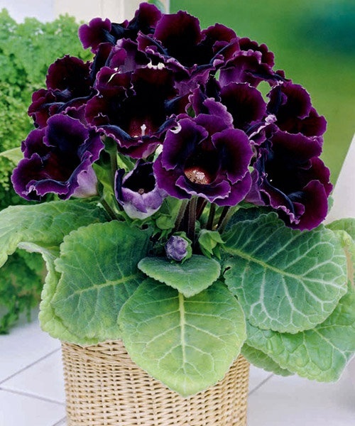Глоксиния Виолацеа – великолепное компактное многолетнее растение, высотой не более 25 см, с крупными бархатистыми, блестящими, зелеными, слегка опушенными листьями мягкой овальной формы, имеющими серебристые прожилки. Цветки- размером до 10 см, обладают бархатистой фиолетовой окраской с сиреневым кантом. Горлышко цветка бело-кремовое, исчерчено полосками и легкими веснушками такого же оттенка. Одна из особенностей лепестков глоксинии – слегка гофрированные края. Выращивают глоксинии чаще всего в качестве горшечной культуры. Также превосходно будут смотреться в подвесных кашпо. Период цветения с июня-сентябрь.
