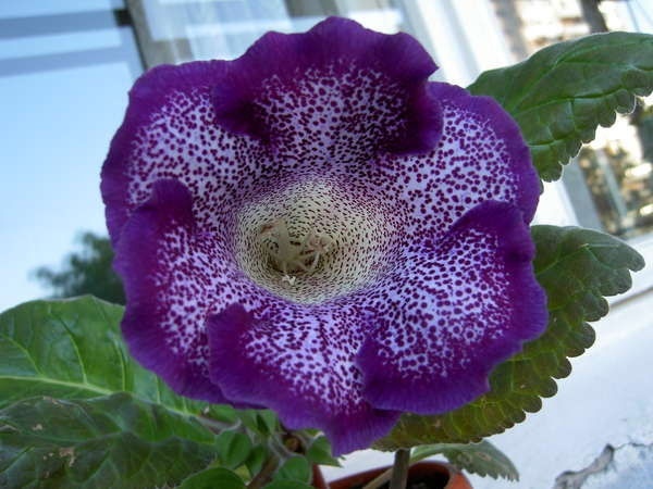 Глоксиния Тайгер Блю - является одним из самых привлекательных сортов. Это низкорослое растение, достигающее высоты 20-25 см. Кустик глоксинии обладает крупными листьями темно-зеленого цвета. Листья узорчатые, бархатистые и опушенные. Цветоносы глоксинии крепкие и высокие. Период ее цветения приходится на май-сентябрь. Цветки имеют форму колокола и отличаются большим размером – около 10-12 см в диаметре. Они белоснежные с фиолетово-синей каймой и таким же крапом. Горлышко цветка окрашено в лимонный цвет, а основная окраска представляет собой комбинацию белого и синего оттенков. Глоксиния Тигрина Блю является отличным растением для украшения интерьера жилой комнаты, балкона или лоджии. Период ее цветения приходится на май-сентябрь.
