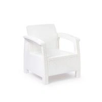 Кресло произведено из высококачественного полипропилена, имитирующего плетение из ротанга. Кресло имеет одно посадочное место, допустимая нагрузка на одно посадочное место - 106 кг . На подлокотниках дивана расположены отверстия для напитков.Кресло может стать идеальным решением по оформлению зоны отдыха в доме, на садовом участке, в офисном помещении или в кафе.Зону отдыха также можно дополнить журнальным столиком и диванами серии «Ротанг». Размеры изделия (ДхШхВ) 730х700х790 мм