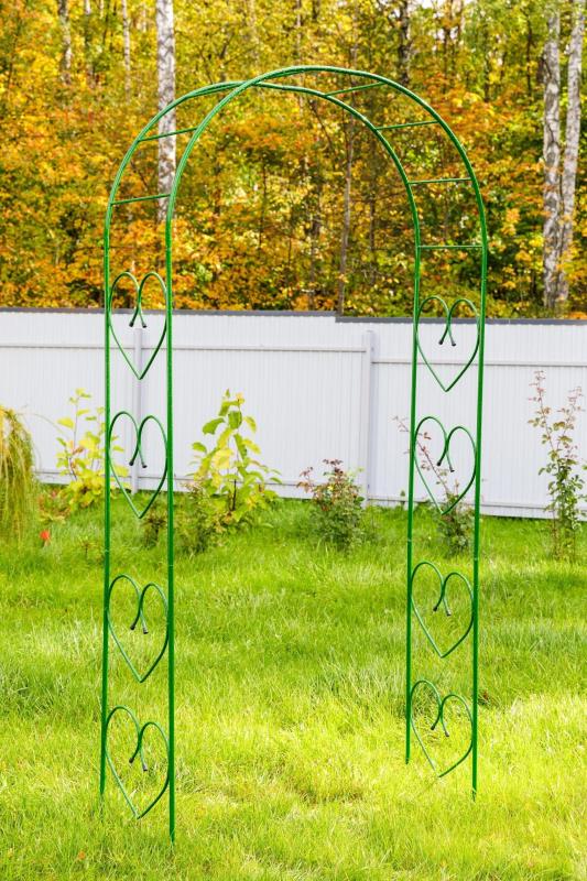 Арка садовая разборная №8 Сердца большая 2,52х1,2х0,41м - это красивая и удобная арка для сада, которая состоит из нескольких элементов, легко разбирающихся и собирающихся. Она применяется для украшения сада и поддержки растений, таких как вьющиеся растения и розы. Арка имеет размеры 2,52 метра в высоту, 1,2 метра в ширину и 0,41 метра в глубину. Особенностью арки является ее разборная конструкция, что позволяет легко транспортировать и хранить ее в разобранном виде. Преимуществами товара являются прочность, долговечность и красивый дизайн, который подойдет для любого сада