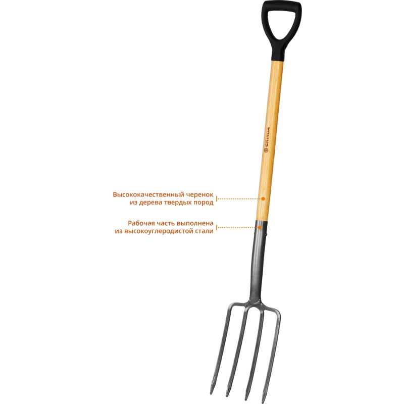 Вилы GRINDA применяются на садово-огородных участках, в сельском хозяйстве, в строительстве. Этот долговечный и функциональный инструмент изготовлен из материалов высшего качества и имеет продолжительный срок службы. Рабочая часть состоит из 4 заострённых зубцов из углеродистой стали с защитным покрытием. Прочный черенок из твёрдой древесины покрыт лаком. В комплект поставки входит чехол из ПВХ, обеспечивающий защиту рабочей части при хранении и транспортировке.