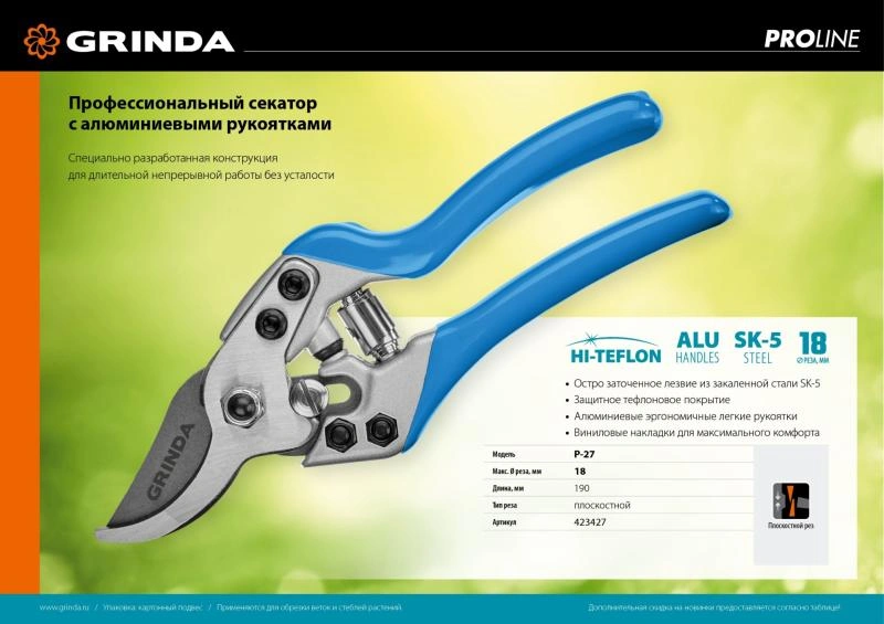 Все секаторы GRINDA являются прочными, долговечными и удобными изделиями, обеспечивая комфортный и лёгкий рез. Они выполнены из высококачественных материалов гарантирующих долгий срок эксплуатации.