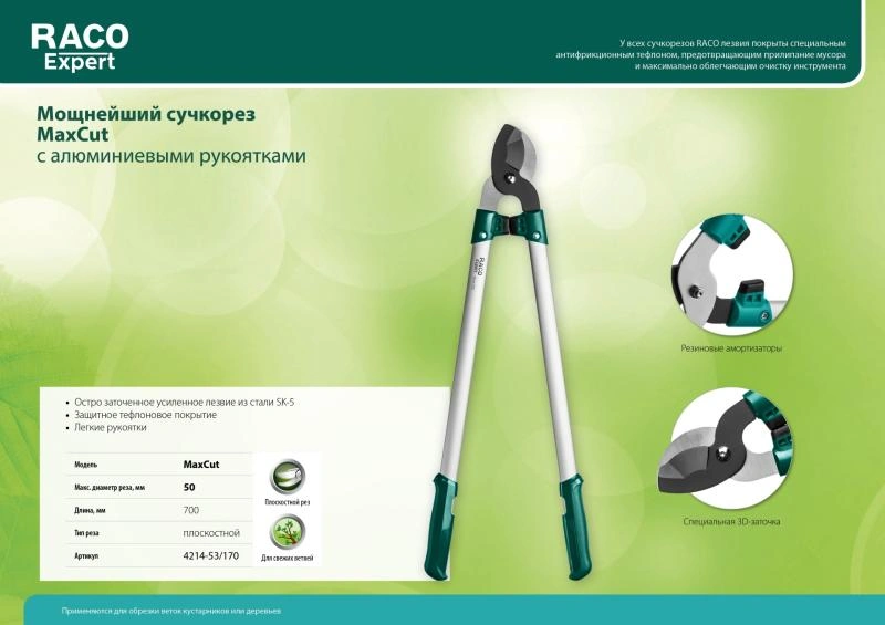 Сучкорезы RACO изготовлены из современных и качественных материалов. Благодаря специальному антифрикционному тефлоновому покрытию лезвий и алюминиевым рукояткам инструменты удобны в работе, идеально срезают ветки и обладают длительным сроком службы.