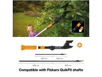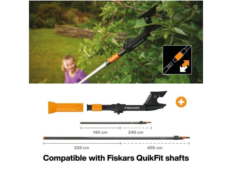 Просто прикрепите веткорез к одному из телескопических черенков Fiskars QuikFitT и наслаждайтесь резкой веткой.