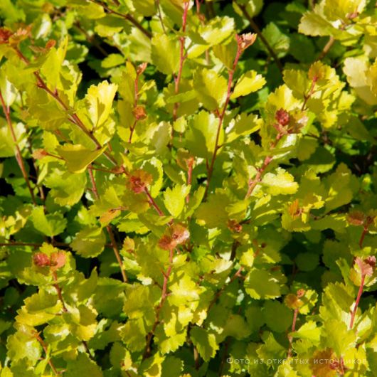 Листва: Листья мелкие, округлой формы, с тупо-зазубренными краями и глянцевой поверхностью. Их главная особенность — ярко-желтый цвет, который особенно насыщен на солнце. Осенью окраска меняется на оранжево-красную или огненную.