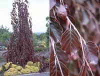 Бук европейский Purple Fountain — краснолистное дерево с вертикальной узкой кроной и плакучими ветвями. Верхушка повисает, поэтому для достижения необходимой высоты дерево нужно подвязывать к опоре.