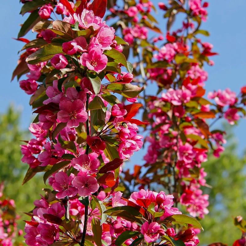 Декоративное среднерослое дерево, достигающее высоты 5-6 метров, имеющее ажурную крону округлой формы. Раскидистость кроны взрослого дерева может достигать 5 метров. Ежегодный прирост побегов дерева составляет 25-35 см.Листья за сезон меняют окрас – от светло-коричневого до сочно-зеленого. Цветение яблони начинается поздней весной (конец мая) и длится несколько недель. В этот период дерево покрывается пышными насыщенно-розовыми цветами, образующими ажур. Аромат при этом невероятно яркий, сладкий и стойкий. Плодоношение начинается в конце августа и продолжается до первых заморозков. В это время дерево становится багряно-красным и продолжает украшать участок или сад. Обильное цветение и плодоношение наблюдается на второй год роста дерева.      Яблоки у дерева съедобные. Они характеризуются небольшими размерами – диаметр до 3 см, правильной формой и необычным вкусом. Яблоки имеют темно-красный окрас, жесткую кожицу, умеренную сочность. По вкусу они кисло-сладкие с выраженной терпкостью.