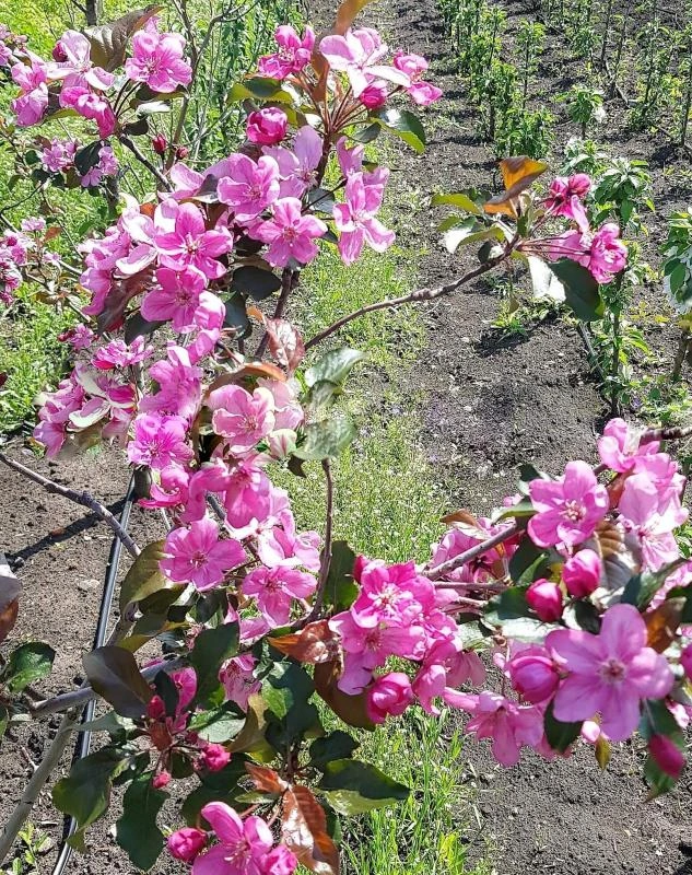 Дерево слаборослое, в 10-летнем возрасте высотой 2,2 м. Вступает в плодоношение на 4-й год после посадки 2-летних саженцев. Крона густая, раскидистая, побеги темно-красные. Весной при распускании листья имеют красноватый оттенок, летом становятся зелеными. Цветки крупные (диаметр более 5 см), розовые,  ароматные, собраны в плотное соцветие по 6 шт. Цветение обильное. После суровой зимы деревья не подмерзают.Урожайность высокая. Плоды позднелетнего срока созревания (конец августа), средняя масса 60г, основная окраска зеленая, покровная – малиновый румянец по всей поверхности. Плоды съедобные, вкус кисловато-сладкий без терпкости и горечи. Ее можно высаживать одиночно и группами , в аллейных посадках или свободной живой изгороди. Очень интересны яблони, выращенные в форме шпалер, кордонов, садового бонсая.