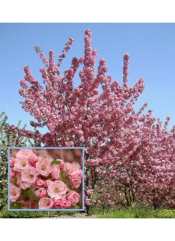 Дерево декоротивное высотой 4-6 м с широко раскидистой, рыхлой кроной и отстоящими ветвями. Листья расположены очередно, яйцевидные или продолговатые, при распускании бронзового цвета, позднее — темно-зеленого цвета, с бронзовым оттенком, осенняя окраска красновато-коричневая или красновато-оранжевая. Бутоны насыщенно-розовые, цветы крупные до 4 см розовые, полумахровые, расцветают в конце мая. Плоды на солнечной стороне, интенсивного оранжевого цвета, на теневой стороне — желтые, в диаметре 4 см, плоскоокруглые, очень декоративные, с сильным ароматом.