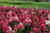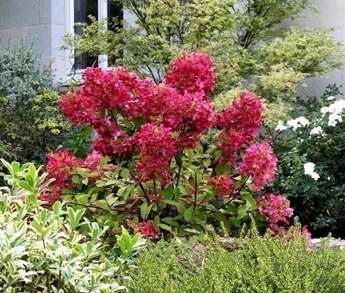 Соцветия у Даймонд Руж крупные, пышные, длиной 30–40 см. Форма соцветий широкопирамидальная. Цветение начинается в конце июня и продолжается до сентября, демонстрируя эволюцию цвета: от чисто-белого через нежно-розовый к насыщенному красному и, наконец, к глубокому пурпурно-красному оттенку.