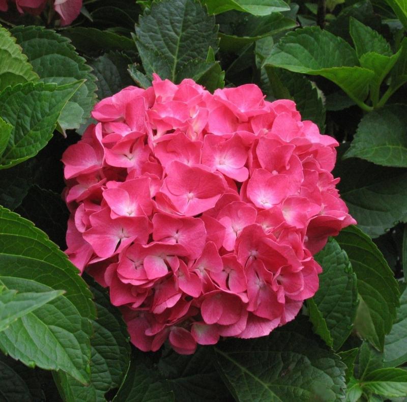 Соцветия: крупные (до 20–25 см в диаметре), шаровидные, плотные. Цветки стерильные, насыщенного розового цвета, интенсивность которого зависит от кислотности почвы. На кислых почвах цвет может приобретать фиолетовые или сиреневые оттенки, на нейтральных и слабощелочных — остаётся ярко-розовым.