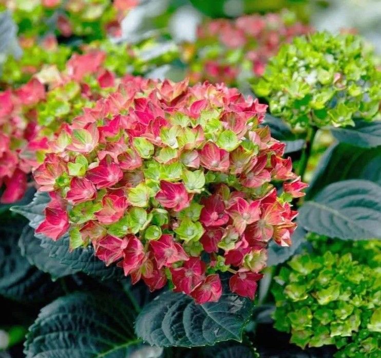 Соцветия шаровидные и крупные, состоящие из мелких цветков. Окраска цветков может изменяться в зависимости от стадии вегетации: на начальном этапе — светло-зелёная или розовато-зеленоватая, на пике цветения — ярко-красная.