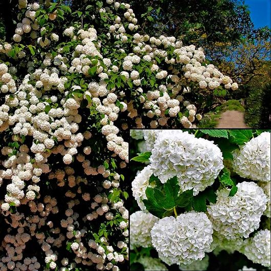 Цветы: Главная особенность — крупные, шаровидные соцветия (около 10 см в поперечнике), состоящие только из стерильных цветков. В начале цветения они имеют зеленоватый оттенок, затем становятся ослепительно белыми и могут слегка порозоветь при увядании. Цветение обычно происходит в мае-июне.
