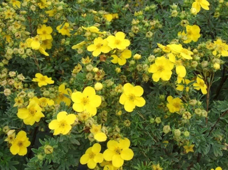 Один из самых распространенных и популярных сортов. Отличается неприхотливостью, нетребовательностью к почве и стойкостью к засухе и зимним морозам (3-я зона зимостойкости). Цвести начинает в июне — и продолжает до конца сентября. При нехватке влаги цветение становится реже, но после хорошего дождя 'Goldfinger' вновь усыпан яркими цветками. Куст прочный, формируется прямостоячими побегами. Хорошо поддается стрижке, поэтому пригоден для создания живой изгороди. Диаметр цветков — 2,5 см, куст округлый, его высота около 130-140 см, диаметр — 150 см.