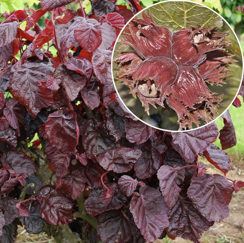 Листья — крупные, немного гофрированные, летом на солнечной стороне кроны — пурпурно-красные, в тени — зелёные с тёмно-красным или пурпурным оттенком.