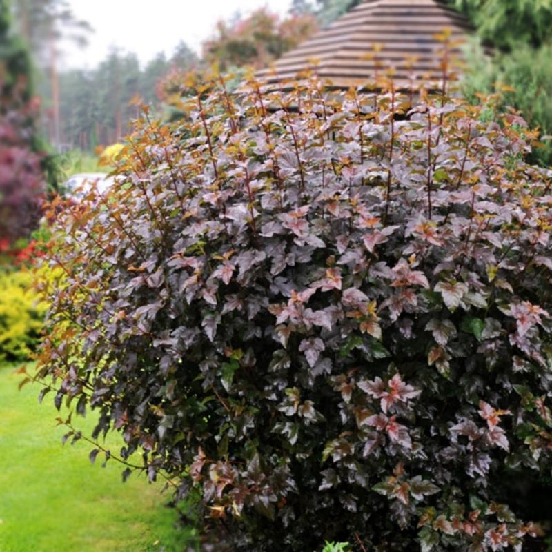 Кустарник высотой 2 м. Крона раскидистая, густая и шарообразная. Побеги темно-красные, дуговидно изогнутые, слегка поникающие, растут вверх. Кора на старых ветках отслаивается полосками. Листья 5-7-лопастные, 7-10 см в диаметре, округло-эллиптической формы, темно-красного цвета, который осенью становится бронзовым, в тени листва зеленая, с красноватым оттенком. Цветы бело-розовые с красной тычинкой, собранные в соцветия, полушарообразной, щитковидной формы. Плоды сборные, красные вздутые листовки. Период цветения – июнь-июль.Пузыреплодник довольно востребован среди ландшафтных дизайнеров. Кусты используют для создания живых изгородей, применяют в групповых посадках с целью создания уникальных и красочных композиций.