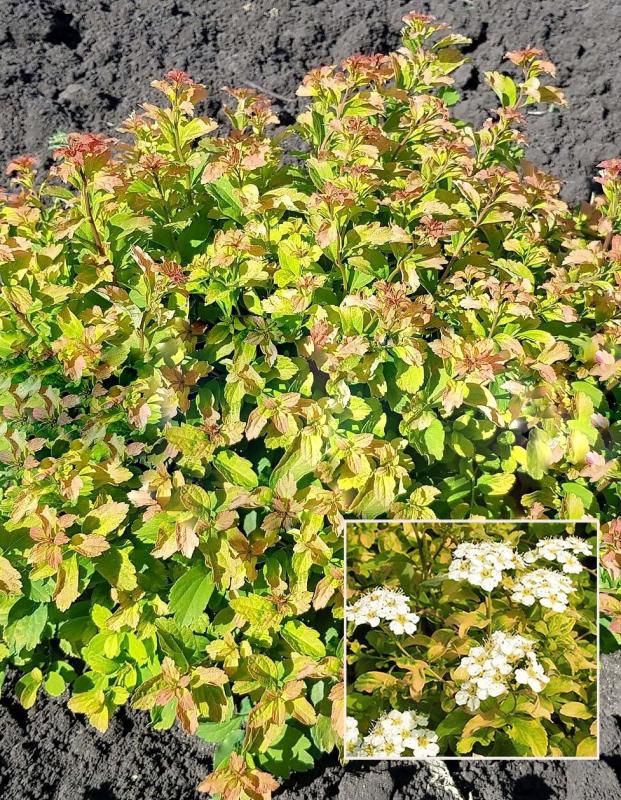Спирея представляет собой невысокий, среднерослый кустарник. Его высота может достигать от 0,6 до 1 м, а ширина – от 0,6 до 0,9 м. Крона плотная и раскидистая. Побеги прямостоячие и горизонтально отклоненные в верхней части. Листья овальной формы, мелкие, имеют оранжево-желто-зеленую окраску.Спирея обладает несколькими преимуществами перед другими видами растений. Она подходит для создания низких бордюров, групповых и сплошных посадок, а также может использоваться в качестве солитера. Кроме того, этот сорт подходит для создания живой изгороди. Спирея обладает густой листвой и крупными щитковидными соцветиями, что делает сорт очень декоративным растением. Однако у него отсутствует аромат.
