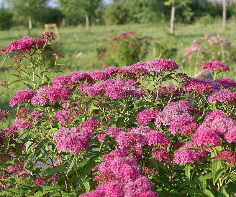 Зигунерблют – листопадный кустарник, обладающий большой силой роста. Может достигать в высоту 1 метра, а в ширину 1.5 м. У описываемой спиреи компактная крона округлой формы с прямостоячими побегами. Особое внимание на резную листву, которая может быть до 80 мм в длину. Молодые листья у описываемого сорта красные, потом они становятся зелеными.У Зигунерблют щитковидные, крупные соцветия шириной до 12 см. Цветы темного красного оттенка, особенно когда только распустились, их цвет особенно насыщенный. Бутоны на кустах спиреи Зигунерблют начинают появляться в июле, цветет кустарник до октября и всегда в большом количестве. Используют для одиночных и групповых посадок, а также для создания альпинариев, рокариев и бордюров. Прекрасно смотрится на фоне других растений и может быть использован для создания живых изгородей.