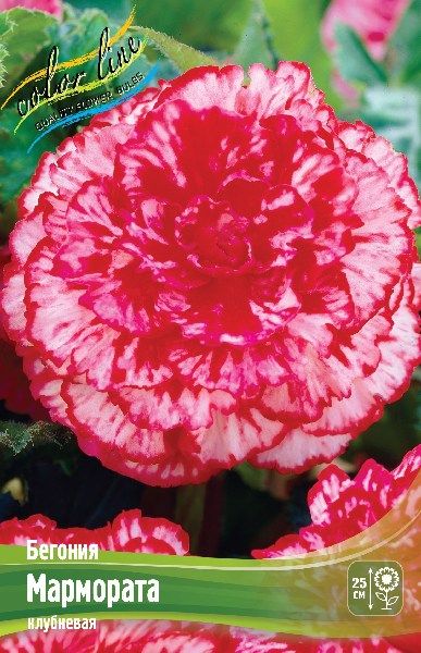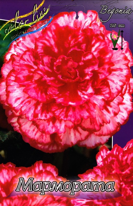 Бегония 'Marmorata' — это клубневое растение с крупными махровыми цветками, отличающимися уникальной мраморной окраской из красных и белых тонов. Растение компактно и идеально подходит для горшков и контейнеров.