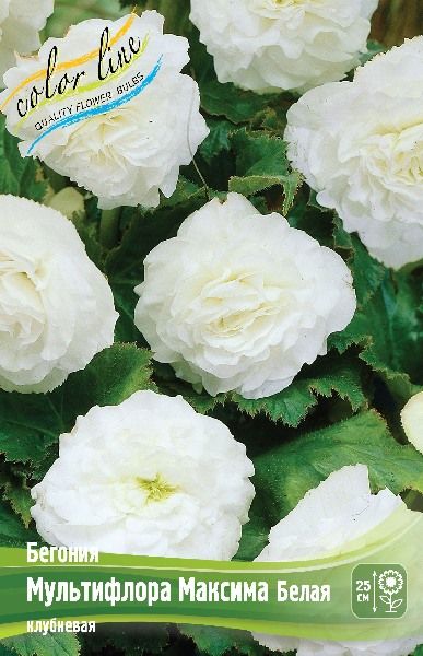 Бегония Мультифлора Максима Белая — это многолетнее клубневое растение с компактными кустами до 20-25 см высотой и длинными побегами, обильно усыпанными крупными (до 10 см), густомахровыми цветками белоснежного цвета. Листья зеленые, яйцевидные. Цветет обильно с июня по сентябрь/октябрь, подходит для клумб, балконов, горшков, любит полутень или рассеянный свет, плодородную почву и нуждается в зимнем хранении клубней.