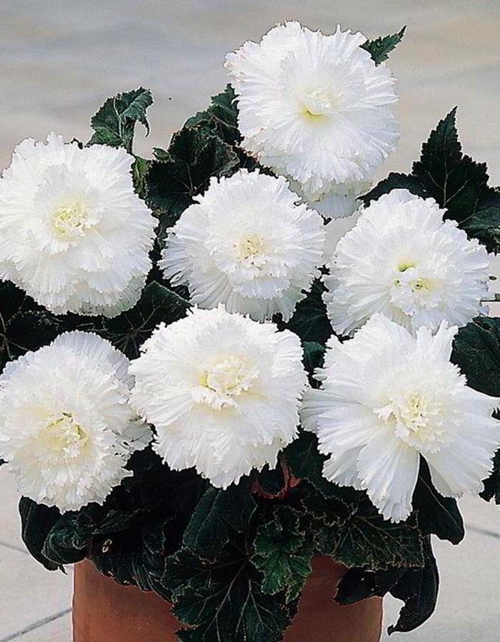 Бегония Бахромчатая Белая (Begonia fimbriata White) — это клубневое многолетнее растение с крупными махровыми цветками белого цвета и характерными изрезанными лепестками, напоминающими гвоздику.