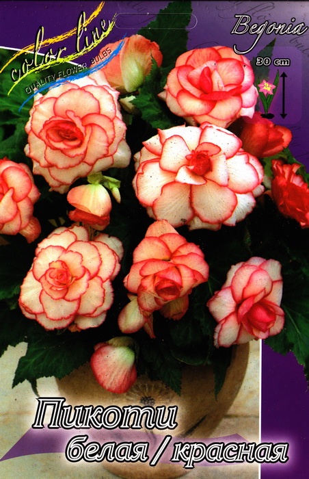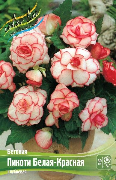 Бегония сорта 'Пикоти Белая/Красная' — это клубневое многолетнее растение с крупными махровыми цветками белоснежного оттенка и яркой красной каймой по краю лепестков.