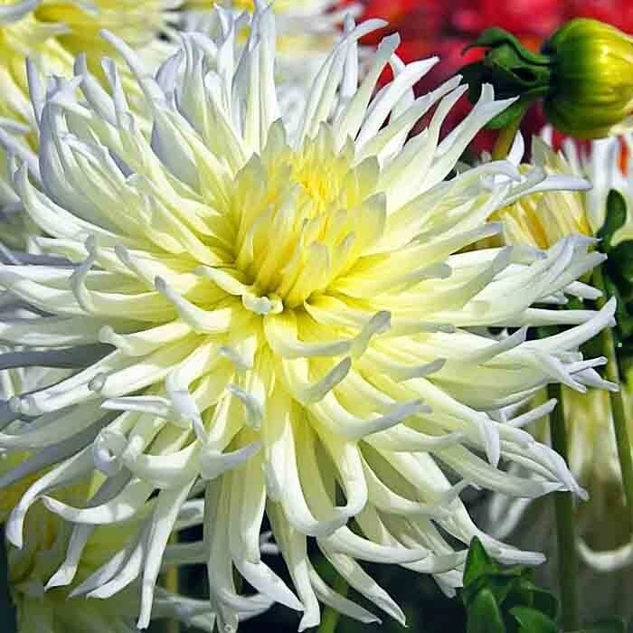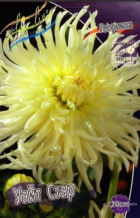 Георгины кактусовой Уайт Стар - это многолетнее травянистое растение, формирующее куст из многочисленных прямостоячих стеблей. Стебли сочные, ветвистые. Листья крупные, с пильчатым краем. У сорта перистые листья и соцветия-корзинки. Цветки крупные 15-20 см. диаметром, состоят из лепестков, скрученных в трубочки (острые кончики напоминают колючку кактуса). Окраска георгины сливочно-белая. Цветение начинается в июле и продолжается до сентября. Используют в миксбордерах и клумбах, в одиночных и групповых посадках на фоне газона. Также это отличное растение для срезки. Растения нужно выкапывать на зиму.
